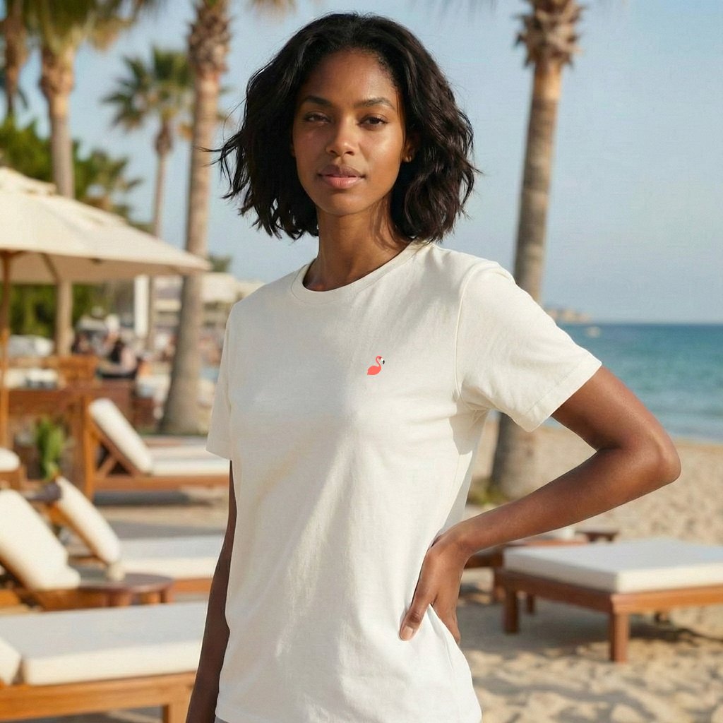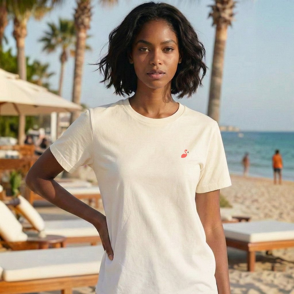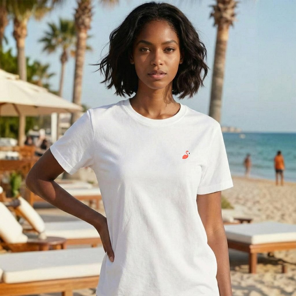 Com modelagem baby look e caimento confortável, possui gola redonda clássica e mangas curtas. O toque macio do tecido e o acabamento refinado garantem versatilidade e estilo para composições casuais contemporâneas.