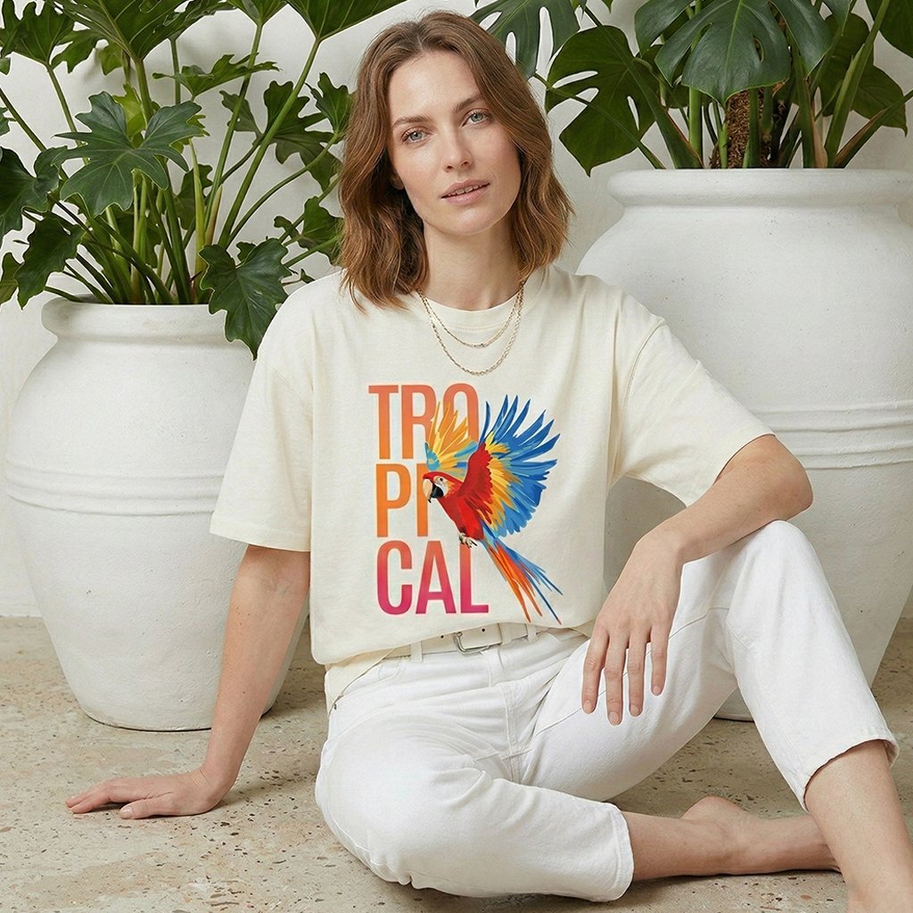 A camiseta Arara Tropical foi desenvolvida para mulheres que valorizam estilo contemporâneo e conforto absoluto. Com modelagem oversized e caimento estruturado, oferece visual moderno, versátil e elegante para diferentes ocasiões.
